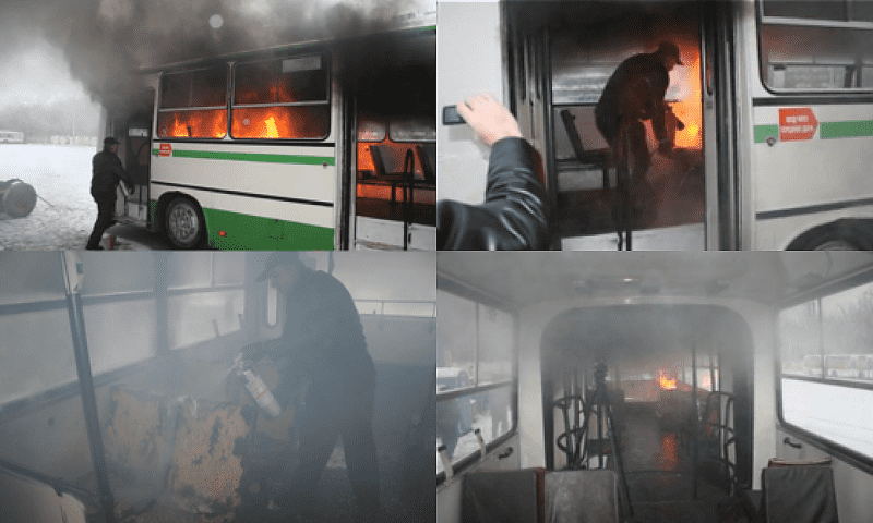 Как известно, лучшее подтверждение заявленных свойств, качеств и рабочих характеристик любого огнетушителя — его испытания в реальных условиях, то есть подавление возгорания транспортного средства. Не так давно сотрудники компании «БОНТЕЛ» провели демонстрацию работы своих огнетушителей на базе крупного перевозчика Московского региона — компании «Мосгортранс». Задача заключалась в ликвидации возгорания в различных элементов салона автобуса. Задействованы были двухлитровые огнетушители «БОНТЕЛ» и пятилитровые углекислотные другого производителя. По этическим соображениям мы не станем называть его имени. За сутки перед началом испытаний огнетушители были помещены в климатическую камеру, где охладились до температуры —16 градусов Цельсия.